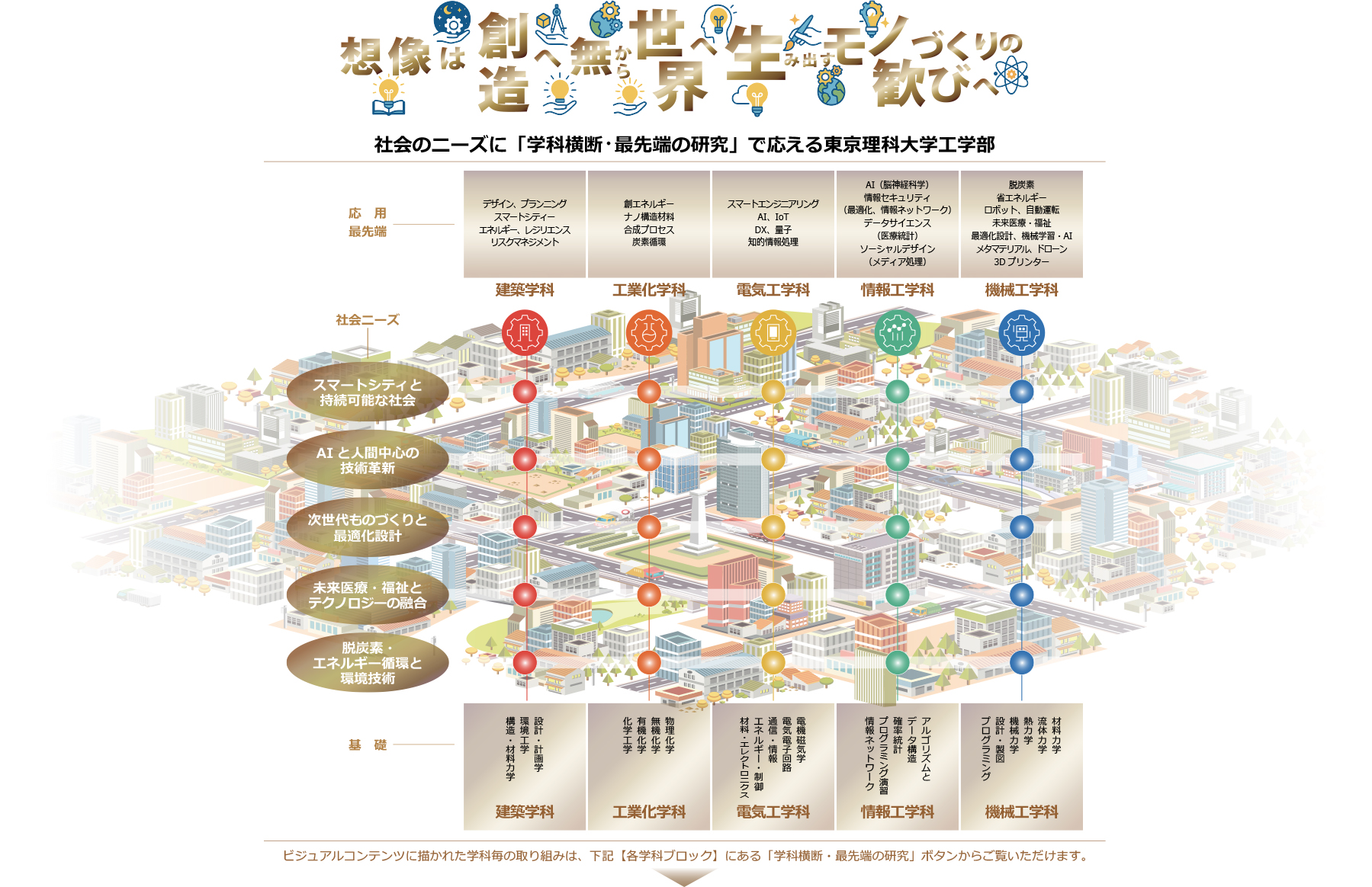 東京理科大学 工学部は、社会の役に立ち、人と生活を支えるモノづくりを最先端の技術で実現します。工学の中心となる建築、工業化学、電気、情報、機械に関する専門分野を、第一線で活躍する教員陣とともに、基礎から応用まで実践的に学びながら、分野を横断して研究します。公園がある開放的な葛飾のパーク型キャンパスと、歴史と路地のある神楽坂の都心型キャンパスで学びます。葛飾はイノベーションの拠点、神楽坂は学問と社会のつながりを実感できるキャンパスです。各学年・各学科がおよそ100名の規模で、お互いの顔が見える学生生活を送ります。本学伝統の実力主義だけでなく、社会のニーズと変化に合わせながら、カリキュラムと研究戦略を改革し続けています。そして、55年以上の伝統を持ち、常に一線で活躍する人材を社会に送り出してきました。